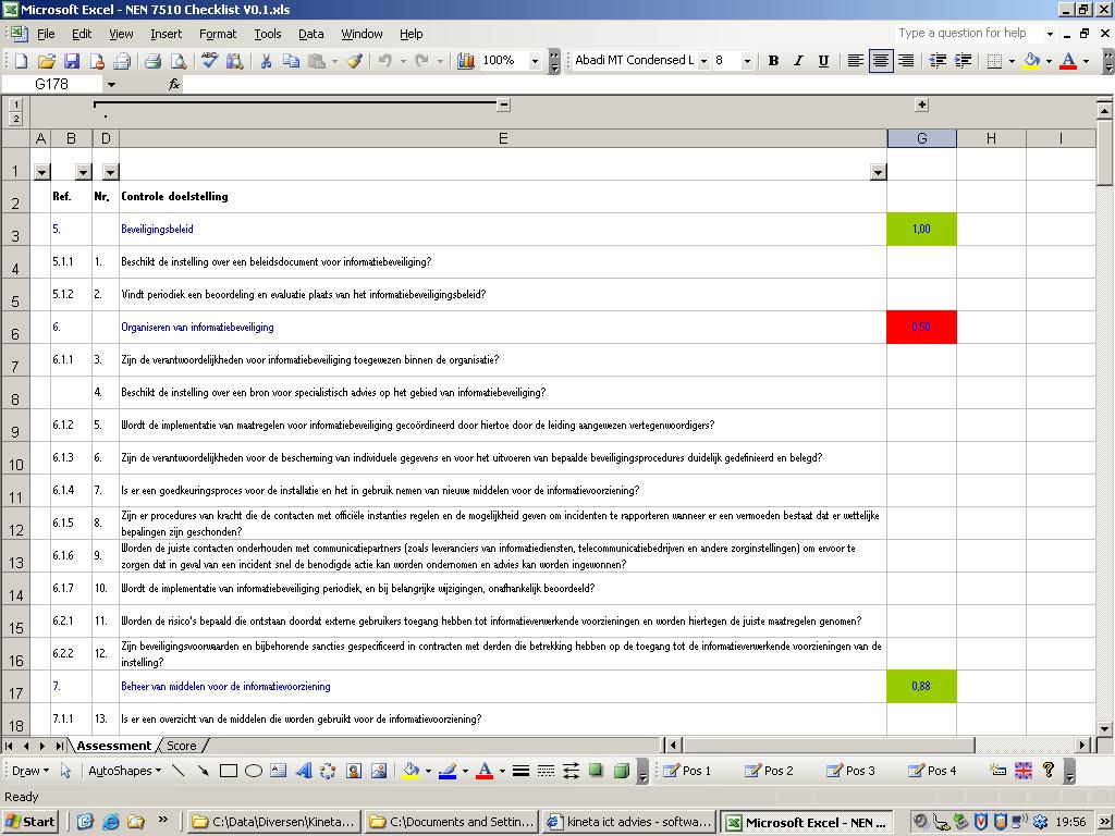 Voor de in de gezondheidszorg voorgeschreven norm voor informatiebeveiliging NEN7510 heeft kineta een eenvoudig gap analysis gereedschap ontwikkeld (klik op de figuren voor grotere afdrukken).